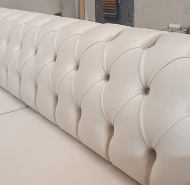 Kumaşlar birinci sınıf kumaşlardan top top gelir. Bunları kesin tezgahına kat kat yatırılır ve üzerlerine çizilen pastalla toplu şekilde kesilir. Kesilen kumaşlar son model elektronik endüstriyel dikiş makineleri ile özenle dikilir. Dikilen kumaşlar. Maharetli ustaların elleri ile nakış nakış beyazlanmış iskeletin üzerine döşenir. Bu işin en özenli çalışmasını içerir.